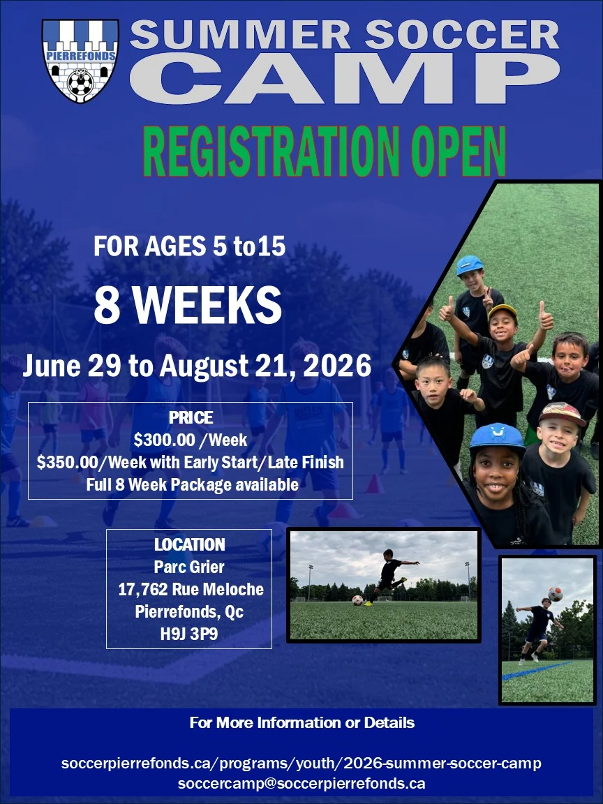 The Pierrefonds Soccer Association announces its 2026 summer soccer camp. This program, focused on development, inclusion, and the player, combines technical and tactical work, teamwork, creativity, and lots of fun.